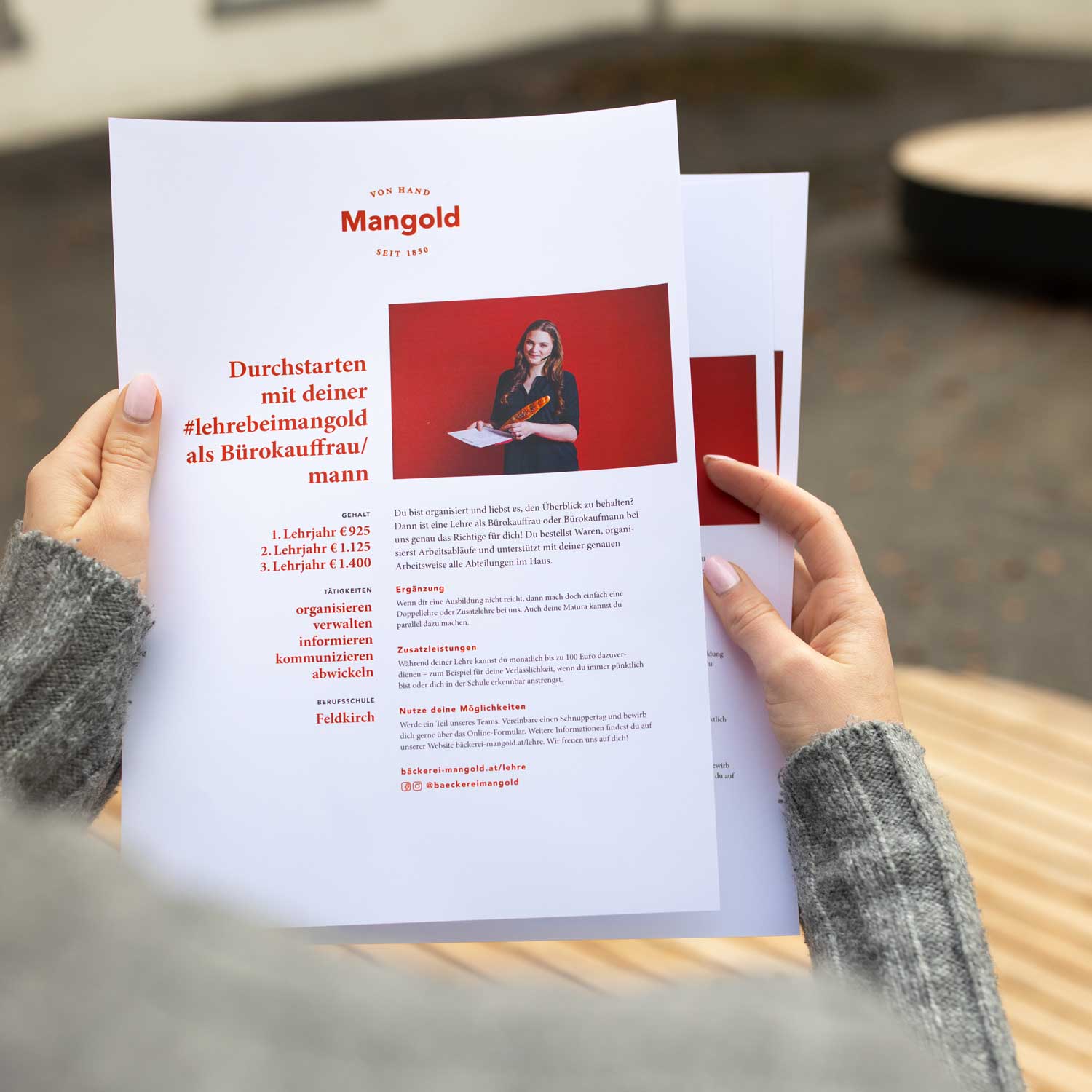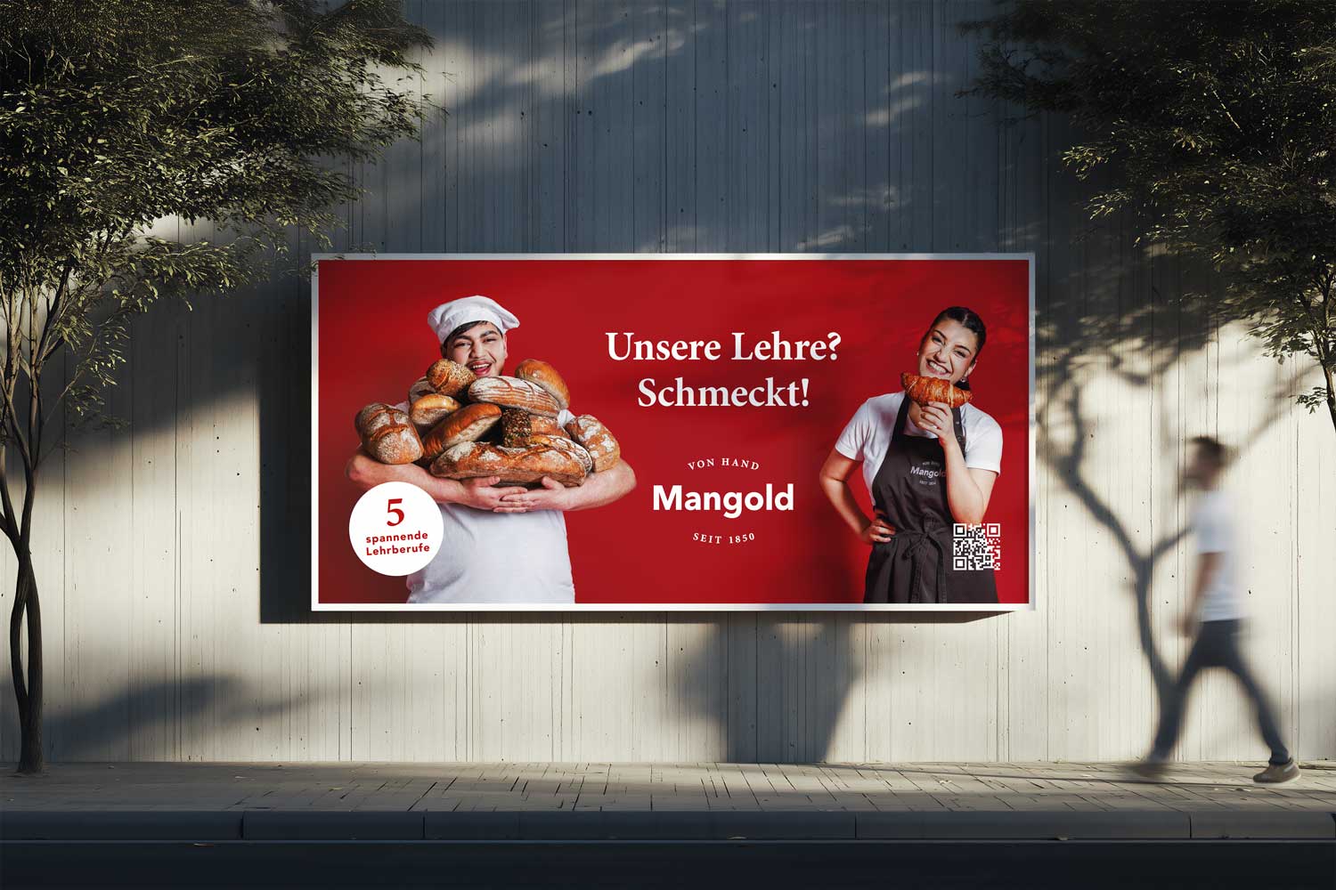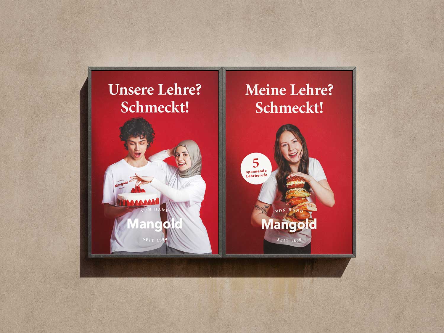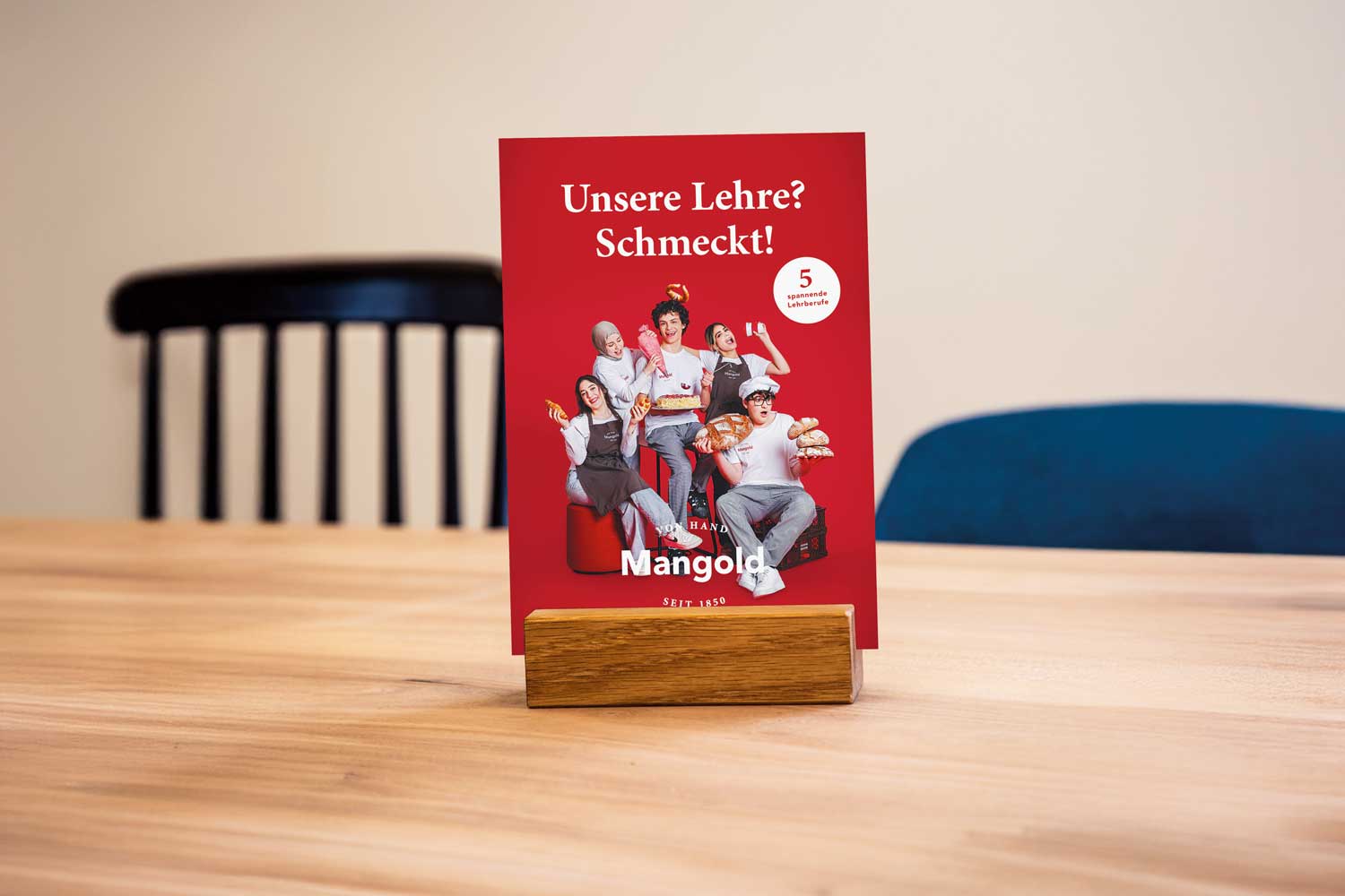 Die neue Lehrlingskampagne zeigt sich als vielseitiges Kommunikationspaket, das auf unterschiedlichsten Touchpoints wirkt: von digitalen Citylights und bewegten Posterlights über Social-Media-Beiträge bis hin zum Auftritt auf der Mangold-Website. Auch im direkten Austausch mit potenziellen Lehrlingen ist sie präsent – etwa auf Lehrlingsmessen. Plakate in den Filialen und Tischaufsteller sprechen zusätzlich Eltern und andere wichtige Bezugspersonen als mögliche Vermittlungspartner an. Alle Elemente greifen stimmig ineinander und formen ein modernes Gesamtbild, das Aufmerksamkeit schafft, Wiedererkennung stärkt und Mangold als attraktiven Ausbildungsbetrieb positioniert.